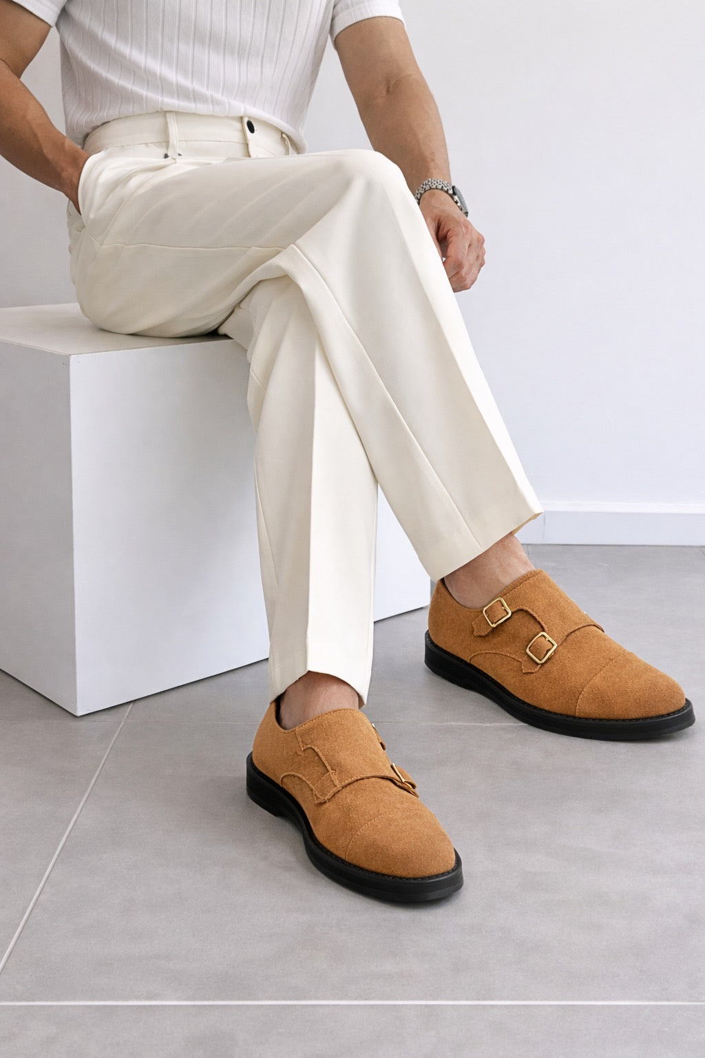 The Monkers suede double monk strap shoes are crafted from premium Tan suede, offering a refined European silhouette with timeless elegance. Designed with dual buckle straps for a classic yet modern look, they feature a lightweight EVA sole for enhanced comfort and flexibility. The interior is finished with soft leather lining and a leather insole, ensuring superior breathability and all-day comfort. Perfect for formal occasions and smart-casual styling, Monkers reflects the craftsmanship and sophistication of RNK Luxe.